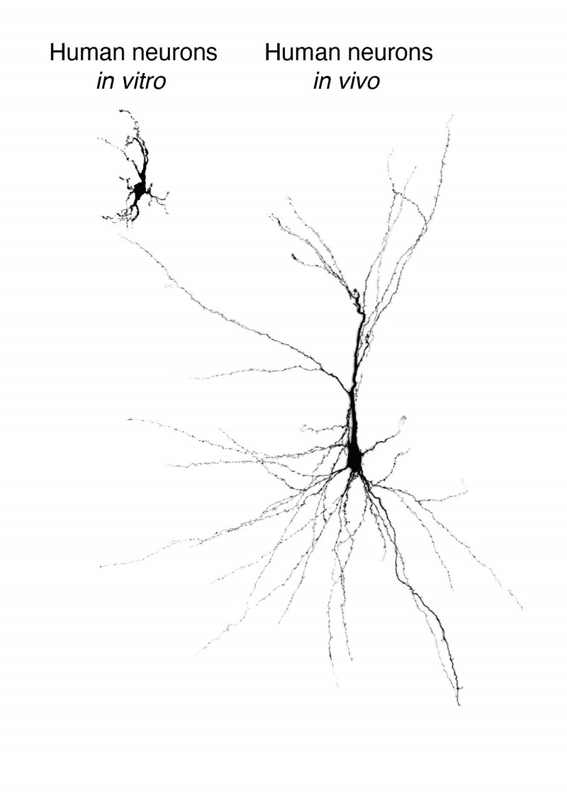 来自干细胞的重建人类神经元,在培养皿中维系并移植到大鼠大脑皮层中。
