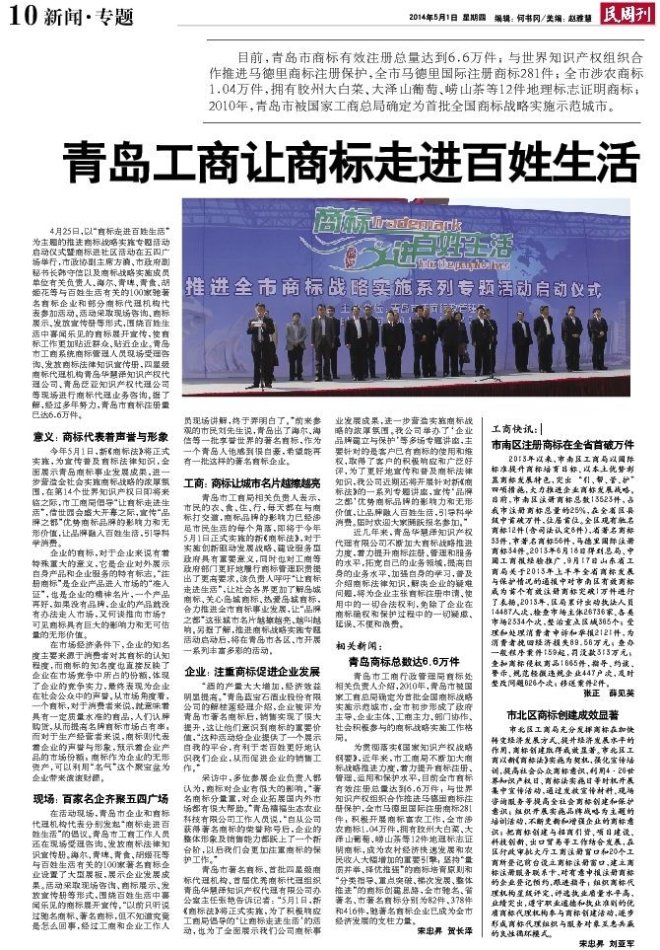 青岛市工商局相关负责人表示,市民的衣、食、住、行,每天都在与商标打交道,商标品牌的影响力已经涉足市民生活的每个角落,即将于今年5月1日正式实施的新《商标法》,对于实施创新驱动发展战略、建设服务型政府具有重要意义,同时也对工商等政府部门更好地履行商标管理职责提出了更高要求。该负责人呼吁“让商标走进生活”,让社会各界更加了解岛城商标、关心岛城商标、热爱岛城商标,合力推进全市商标事业发展,让“品牌之都”这张城市名片越擦越亮、越叫越响。另据了解,推进商标战略实施专题活动启动后,将在青岛市各区、市开展一系列丰富多彩的活动。