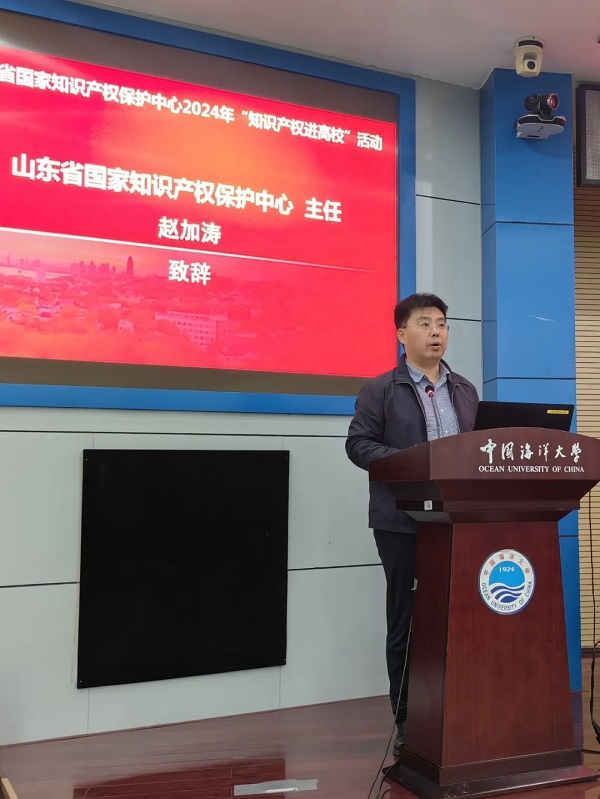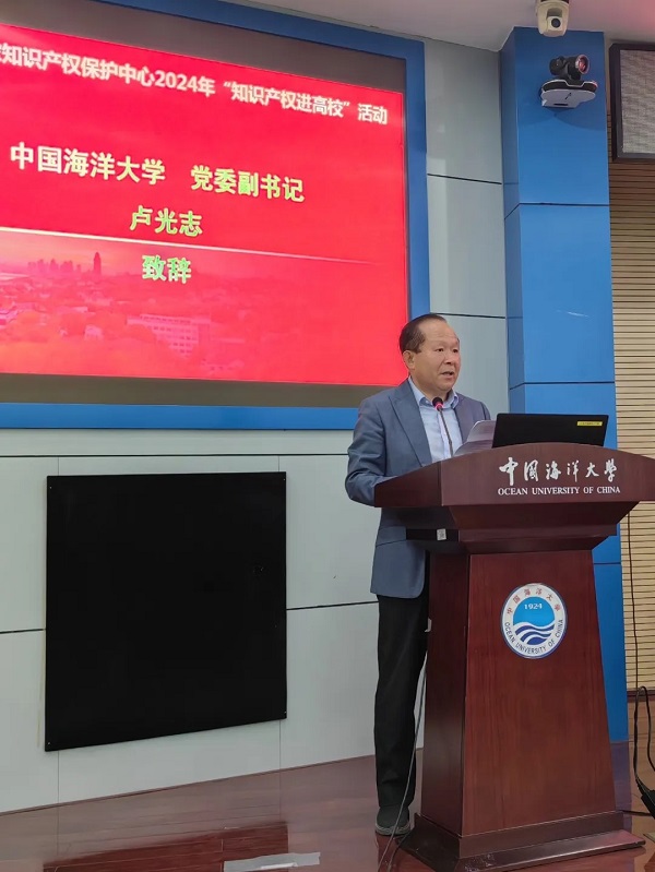 4月25日,宣传周主题活动——山东省国家知识产权保护中心“知识产权进高校”在崂山校区成功举办。中国海洋大学党委副书记卢光志,山东省国家知识产权?;ぶ行牡匙苤榧恰⒅魅握约犹纬鱿疃⒅麓?。青岛市知识产权?;ぶ行闹魅喂笈?、青岛市市场监督管理局知识产权运用促进处处长栾华、国家级知识产权保护中心(青岛)建设工作领导小组办公室执行副主任郑昆、崂山区市场监督管理局副局长李燕妮、国家知识产权局战略规划司苏强、中国海洋大学图书馆馆长谷强、青岛华慧泽知识产权代理有限公司董事长张万伟出席,校学术委员会办公室副主任褚嘉杰主持活动。