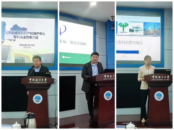山东省国家知识产权?;ぶ行囊滴窆歉少”妥ɡ焖僭ど蠓瘛⒏卟愦稳瞬旁ど蠓裰蓖ǔ?、批量预审等进行宣讲。国家知识产权局战略规划司苏强以经济学视角简述知识产权制度演进,以及知识产权与科技创新、产业发展、国际贸易的关系。青岛华慧泽专利代理事务所合伙人贺敬虹围绕高价值专利培育和布局进行讲解,介绍了高价值专利的申请策略、培育过程以及专利布局的原则、策略等内容。中国海洋大学科学技术处、图书馆、信息服务中心及各学院师生代表100余人参加活动。