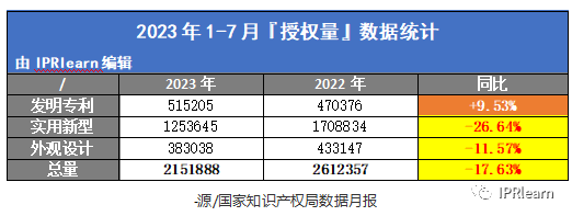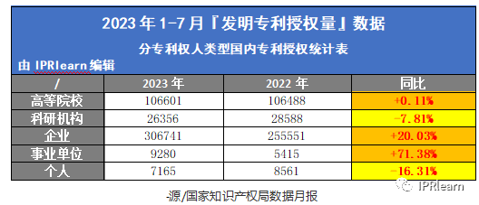 根据国知局公布的月报(分专利权人类型国内专利授权统计表)2023年1月-7月发明专利授权量与去年同比: