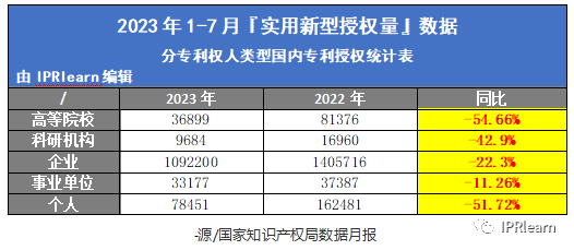 根据国知局公布的月报(分专利权人类型国内专利授权统计表)2023年1月-7月实用新型授权量与去年同比: