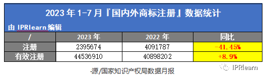 2023年1月-7月共注册商标2395674件,同比下降41.45%。截至目前,我国有效注册商标量达4089.8万件,同比增长8.9%。