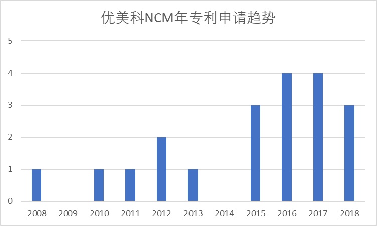 在HimmPat中国数据库中进行检索发现,在NCM三元正极材料领域中,优美科有20件中国授权专利,从2008年开始不断进行专利申请,可以看出,在NCM三元材料领域,优美科授权专利的权利要求数量、申请文件页数、被引用专利次数以及简单同族数,均远高于领域的平均水平,优美科布局了大量的高价值专利,构建了强大的专利壁垒。