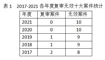 从复审关注度看,我们注意到近5年国家知识产权局发布的各年度专利复审无效十大案件,统计结果如表1所示。从整体上看复审案件的占比较少,特别是近两年的复审案件均为0件,表明复审案件低于无效案件的关注度,也表明近两年复审案件中出现的典型案例和指引较少。“2021年,共受理专利无效宣告请求7628件”,这与专利复审请求7.6万件相比,在数量对比上仅为复审案件的十分之一。因此,专利复审仍然是专利复审和无效审理部的主要工作。