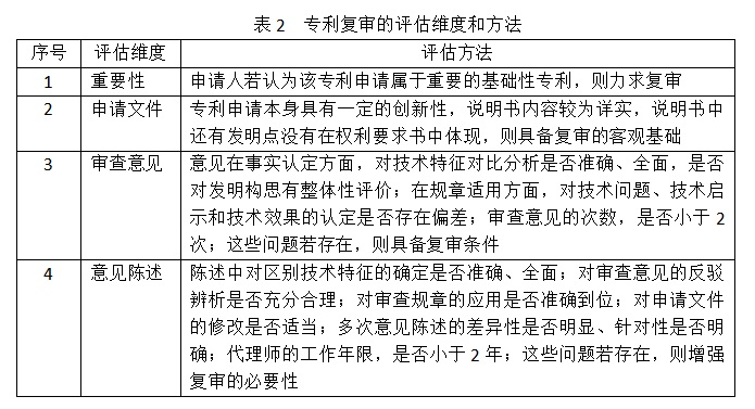 做好复审评估。结合表2,可以从以下四个维度对专利复审进行评估。评估的目的是为了能够更加客观的认识前期被驳回专利的实际情况,让专利复审具有客观依据和可操作性,减少和避免专利复审决策的盲目性和盲从性,因此可以成为申请人实施专利复审的流程要求,也可以是专利代理机构委案复审的前置程序。复审评估通常需要计入到复审成本中。
