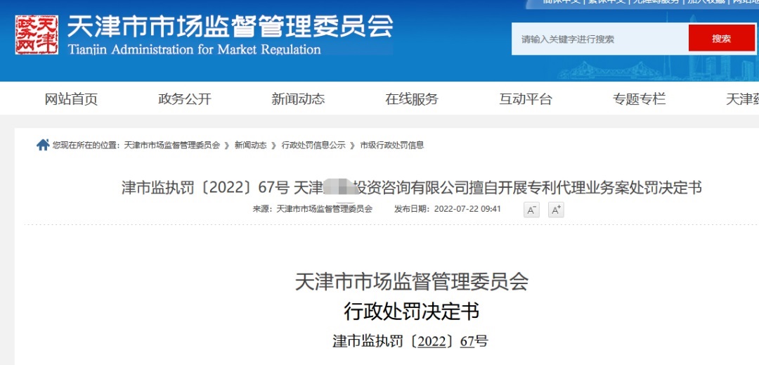 津市监执罚〔2022〕67号 天津XX投资咨询有限公司擅自开展专利代理业务案处罚决定书