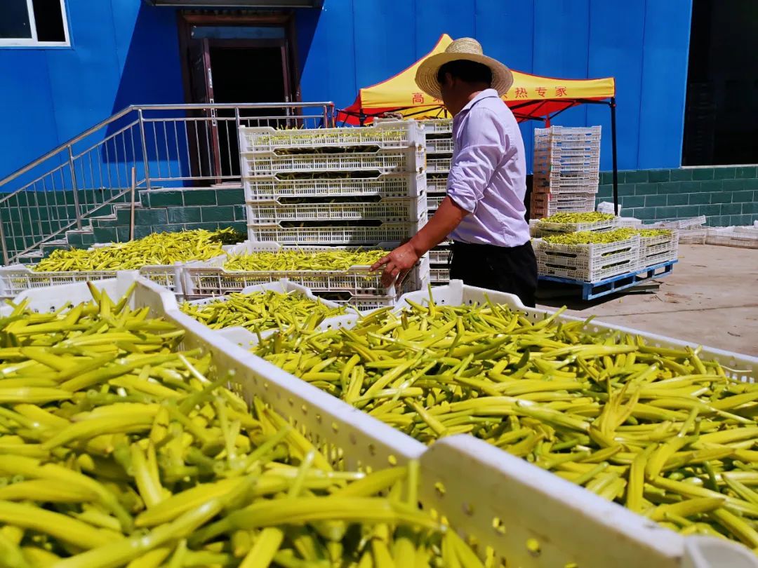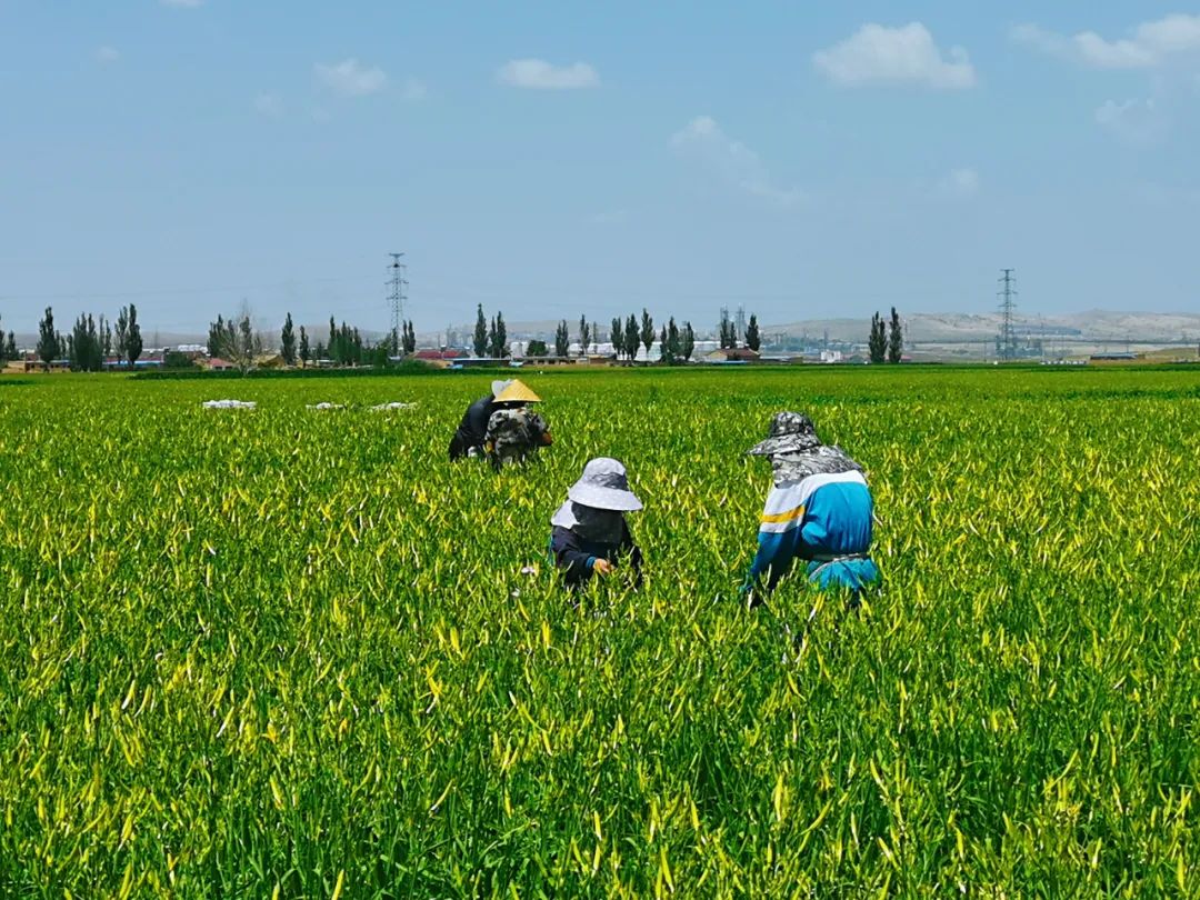 盛夏的七月,走进宁夏吴忠市盐池县惠安堡镇大坝村,金灿灿的朵朵黄花镶嵌在绿叶间格外耀眼,一个个忙碌的身影穿梭在基地里,正在作业采摘的就是叶片细长发散的植物——黄花菜。