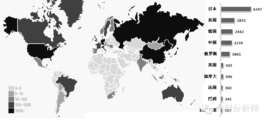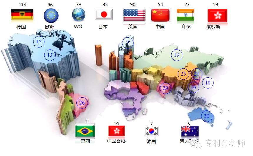 (1)国家区域分布。专利制度自诞生之日起就具有地域属性。在专利的地域属性中最突出的一项就是专利的地域分布,其表征了申请人专利布局的选择和意向,也与申请人希望获得专利保护的范围密切相关。市场规模大、法律法规完善的地区往往是专利权人优先布局的选择。通过专利分析在不同国家的专利分布情况,可以掌握哪些国家或地区是专利的聚集区,在企业进入相应国家或地区时,还要根据各国专利法规进行深入的专利分析。