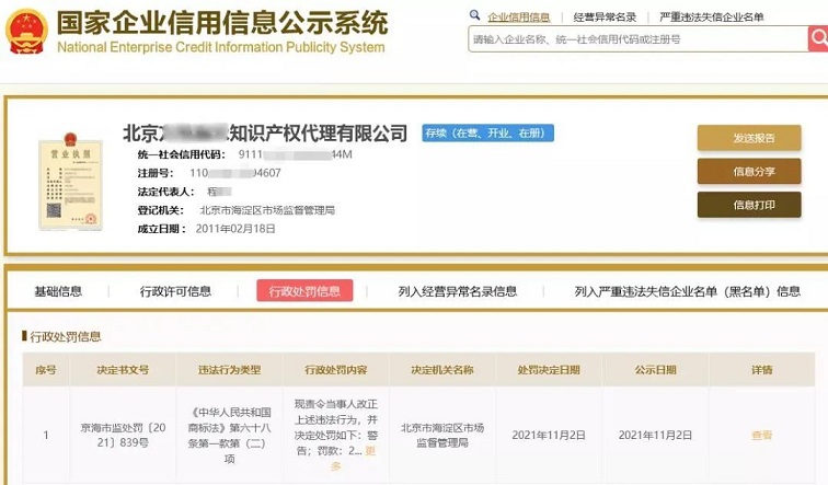 近日,国家企业信用信息公示系统发布了一则行政处罚信息。北京一知识产权代理有限公司在商标局官网未曾下发正式驳回通知的情况下就通知申请人其申请商标被驳回,涉嫌以不正当手段扰乱商标代理市场秩序。北京市海淀区市场监督管理局现责令该公司改正违法行为,并决定处罚如下:警告;??睿?0000元。此前,IPRdaily曾发布《自称直属国知局,能够提前预测商标被驳回?》一文。