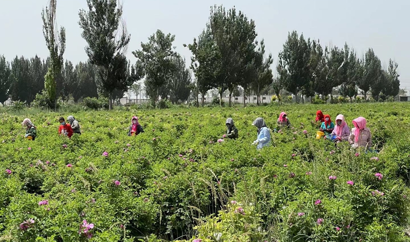 图为宁夏嘉禾花语生态农业合作社的农户在采摘玫瑰花蕾。 李珮 摄