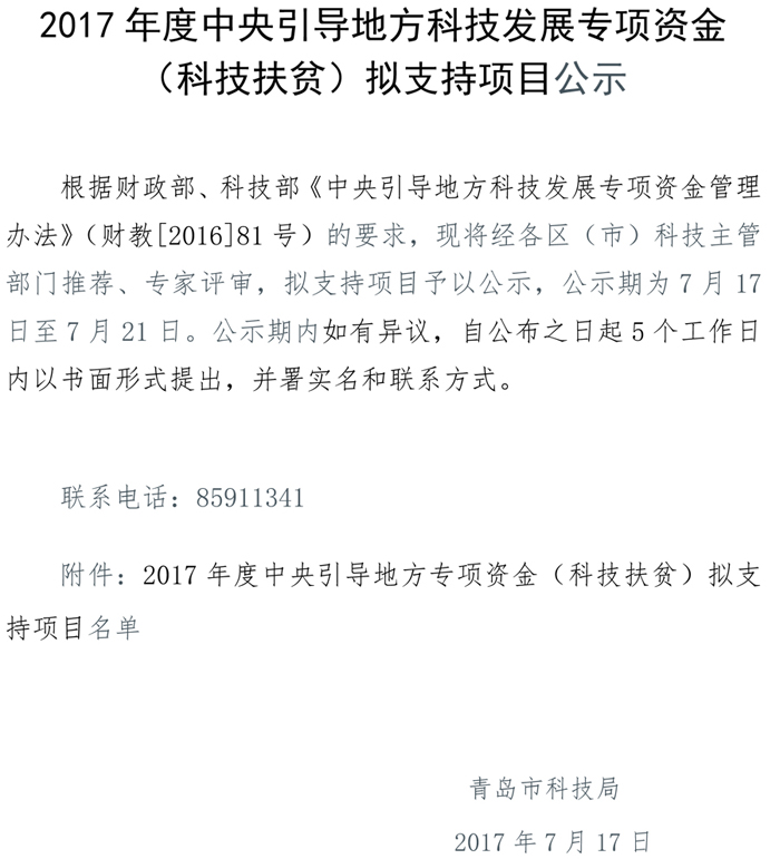2017年度中央引导地方科技发展专项资金(科技扶贫)拟支持项目公示