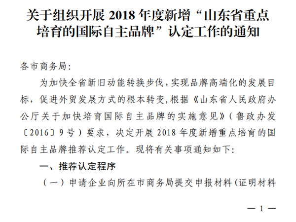 相关下载:关于组织开展2018年度新增“山东省重点培育的国际自主品牌”认定工作的通知.pdf